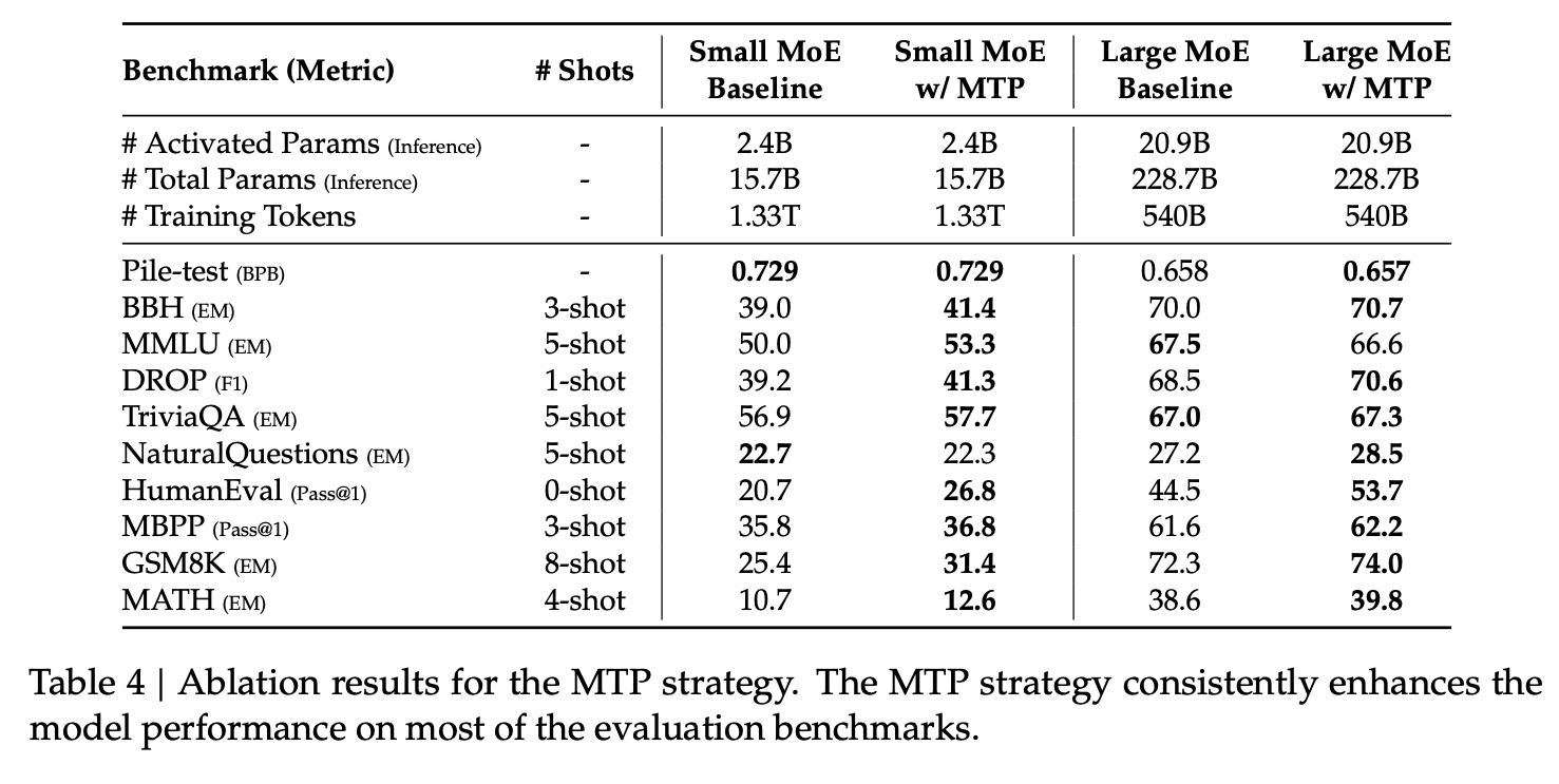 This may improve data efficiency but that’s not the goal here. The goal here is improved representations, because MTP enables pre-planning for tokens further ahead. Here sequentially predict additional tokens and keep the complete causal chain at each prediction depth. During inference the additional MTP modules are removed.