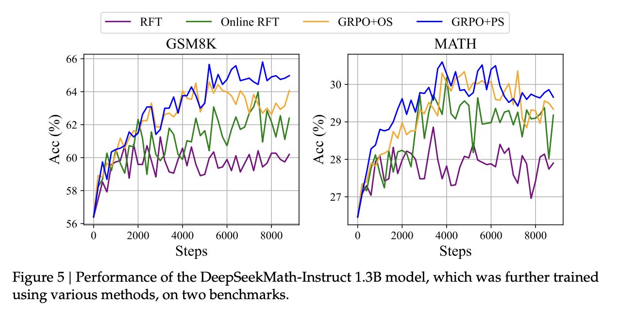 Focus on reinforcement learning: Introduces a new technique called Group Relative Policy Optimization (GRPO), which similar to PPO but without the need for a critic model.